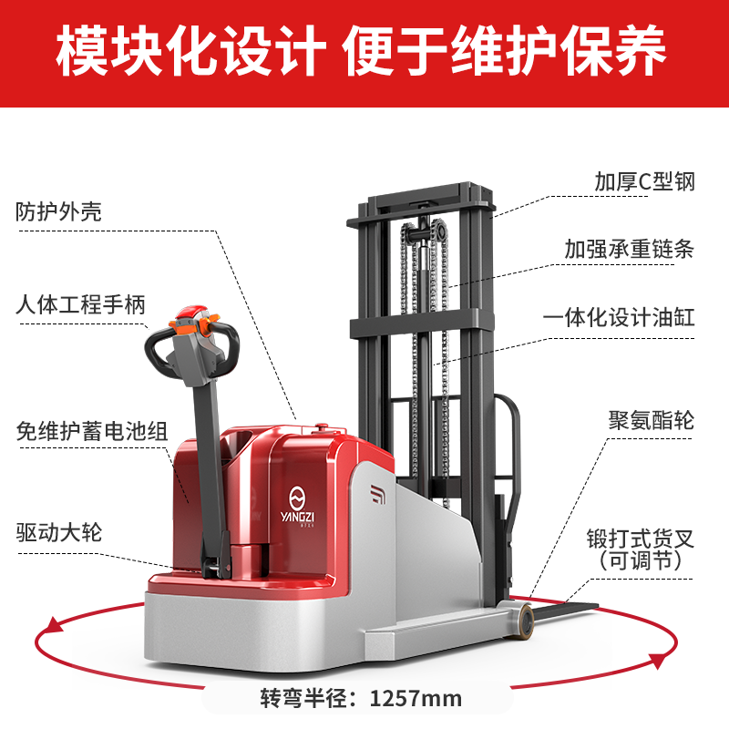 揚子堆高車CPDB:精工鍛造有效載荷高,車身輕,強度高,穩定性能好,一體鑄造油缸,載荷更大杜絕漏油。還有手動緩降控制閥門,采用高性能免維護電池組