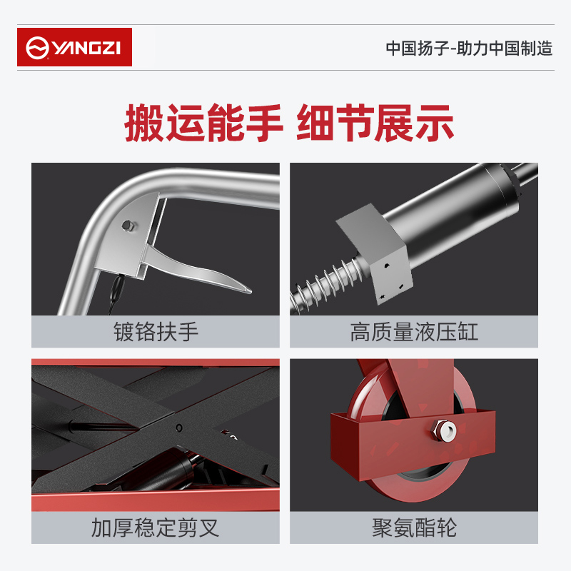 揚子TF-15手動液壓平臺車:品質高端經久耐用,加厚鋼材,升級動力系統,升級油缸系統,加厚剪叉,耐磨腳輪,可折疊手柄,還可以控制速度,防腐蝕,效率高,售后好